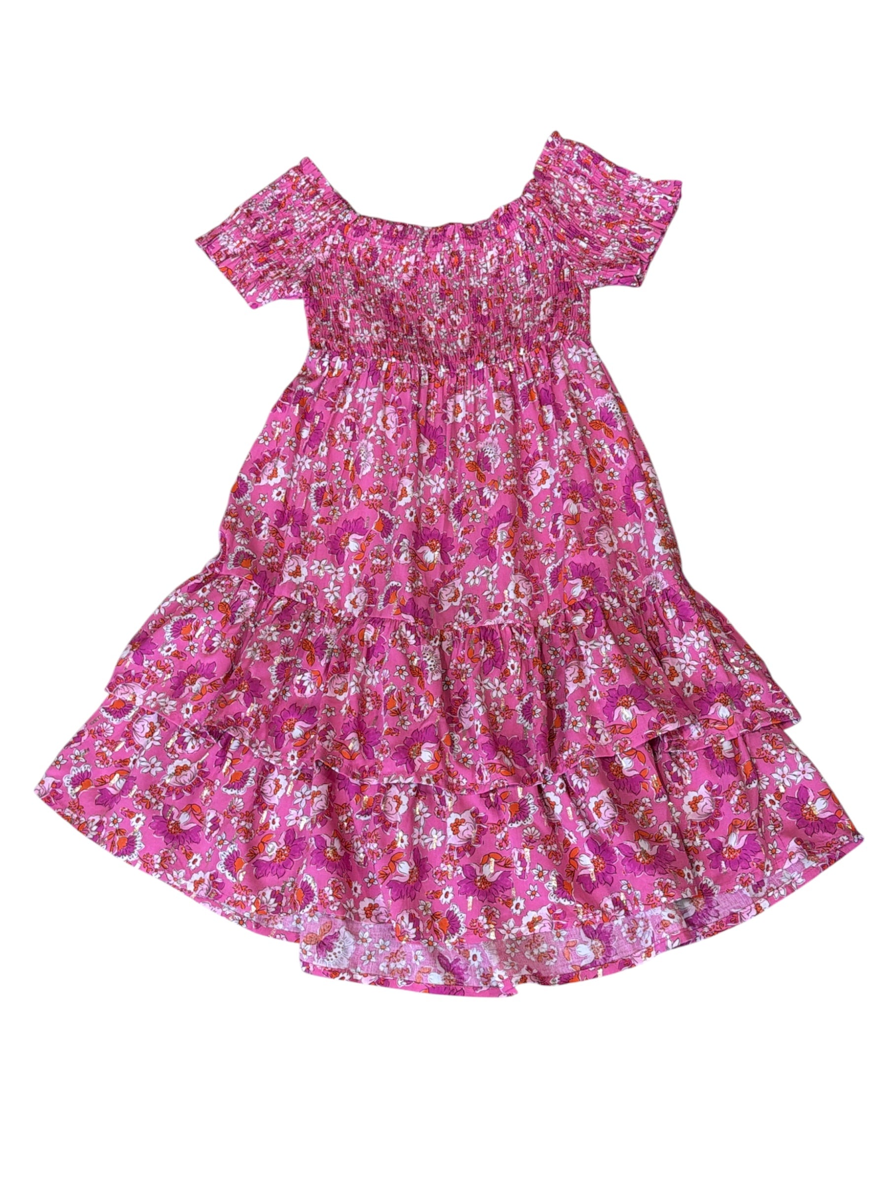 Ready for spring in this bright pink floral dress with a stretchy smocked top and shot sleeves. It features a flowy, tiered skirt with ruffle layers for extra movement.
