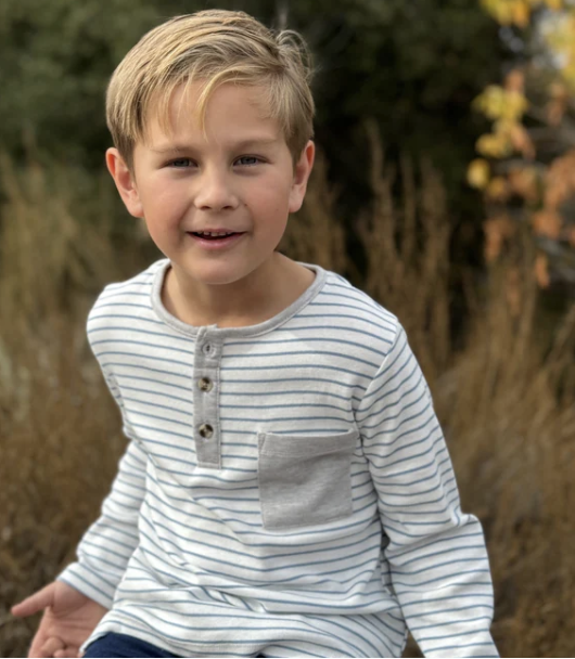 Light Blue and White Stipe Henley with Grey accents on Pocket, Collar, and patch on sleeve.