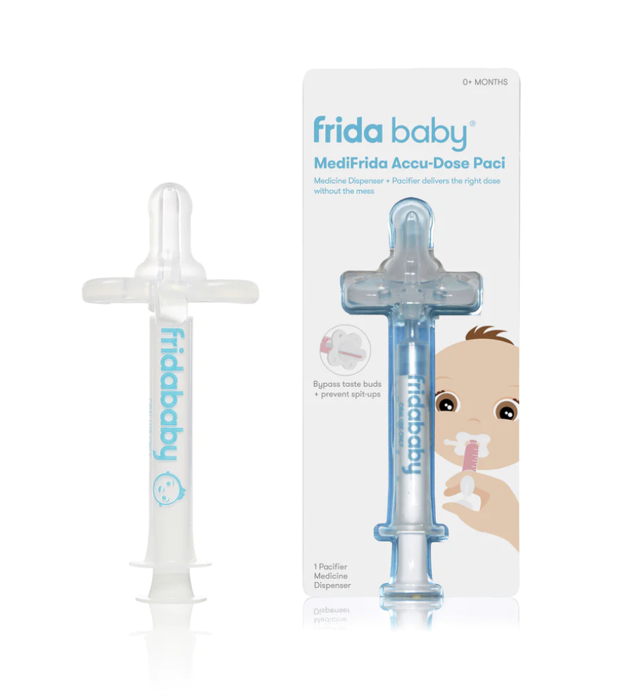 MediFrida delivers the full dose through a soft, familiar paci that sends medicine to the side of the cheek, as recommended by doctors, bypassing baby's taste buds to prevent spit-ups so baby swallows full dose. MediFrida is the only paci-style baby medicine dispenser that doubles as a real pacifier, so dosing doesn't disrupt baby's busy soothing schedule.