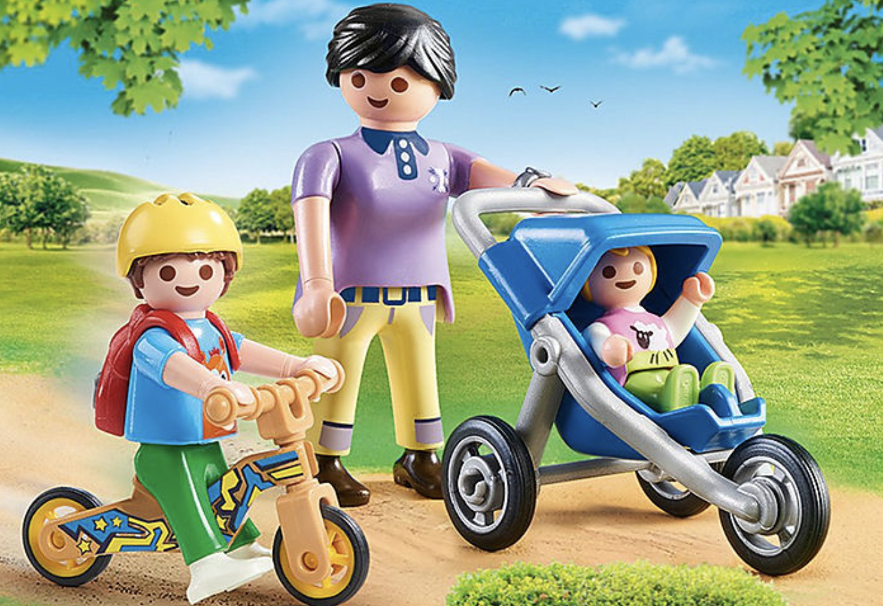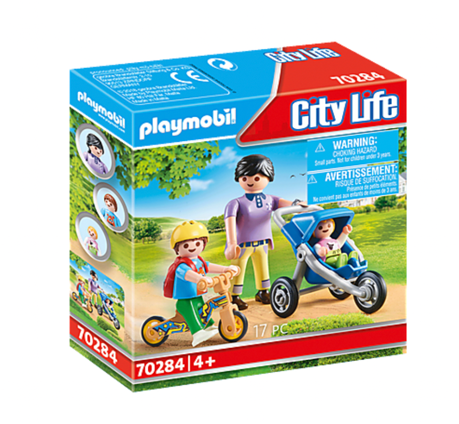 Figures: 1 woman, 1 boy, 1 baby Accessories: 1 children's bike, 1 jogging cart, 1 children's bike helmet, 1 children's backpack, 1 wristwatch.