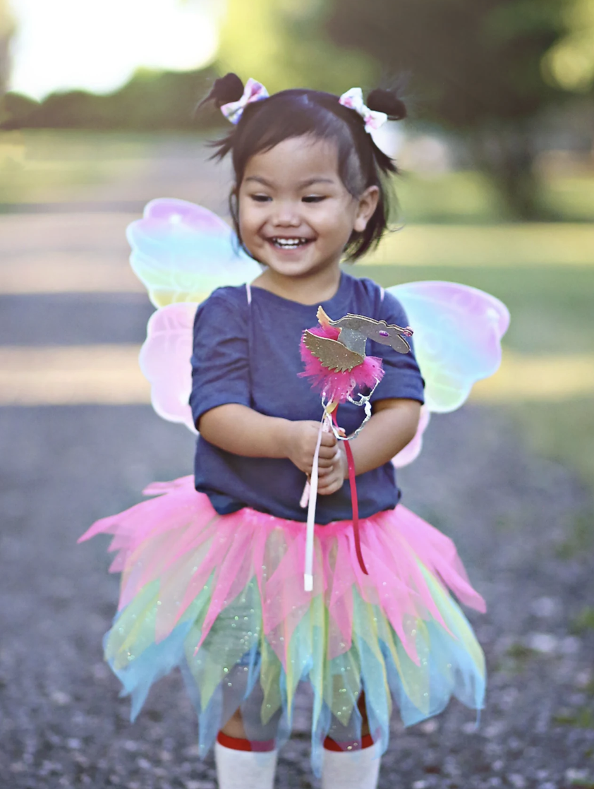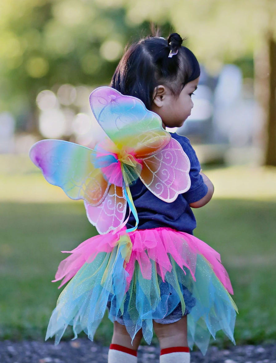 Somewhere over the rainbow you'll find the perfect tutu, wing and wand set! This skirt set is made from soft glitter tricot tulle cut to be petal perfect. The matching rainbow wings feature an amazing glitter print that is sure to sparkle and the rainbow wand finishes this Technicolor treat with matching soft tulle and multicolored ribbons. This three piece set is the perfect addition to play time fashion!