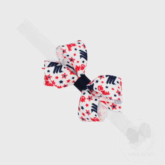 Show your team spirit by wearing this officially licensed collegiate hair bow from our Game Day Collection. This signature collegiate logo print grosgrain hair bow comes on a 5/8 inch soft, stretchy elastic band. Fits 3 months and up. Mini Signature Collegiate Logo Print grosgrain Hair Bow on Elastic Baby Band.