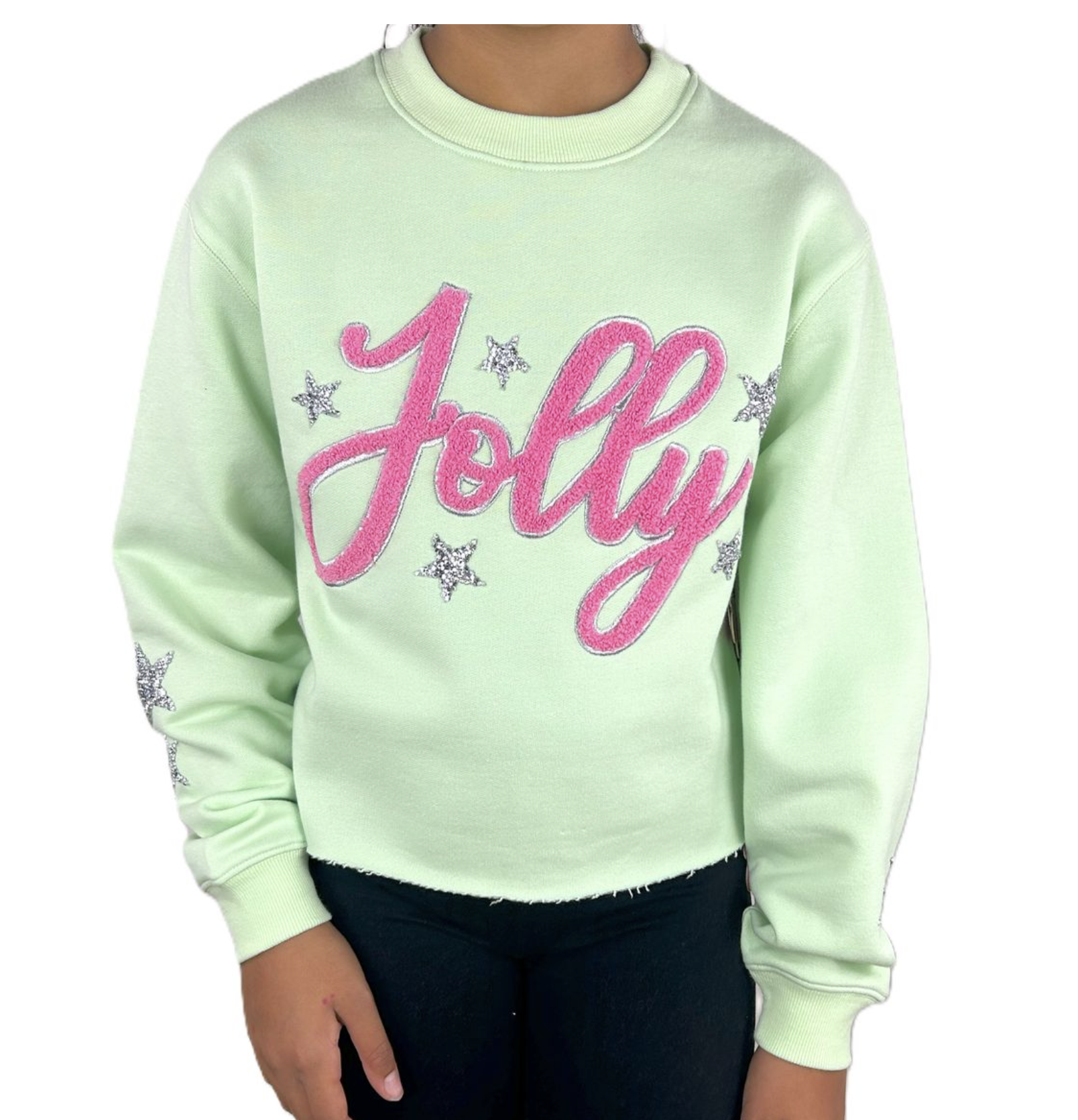 Paper Flower Fleece sweatshirt for tween girls featuring the phrase 'Jolly' in chenille embroidery and multiple stars in rhinestone details.