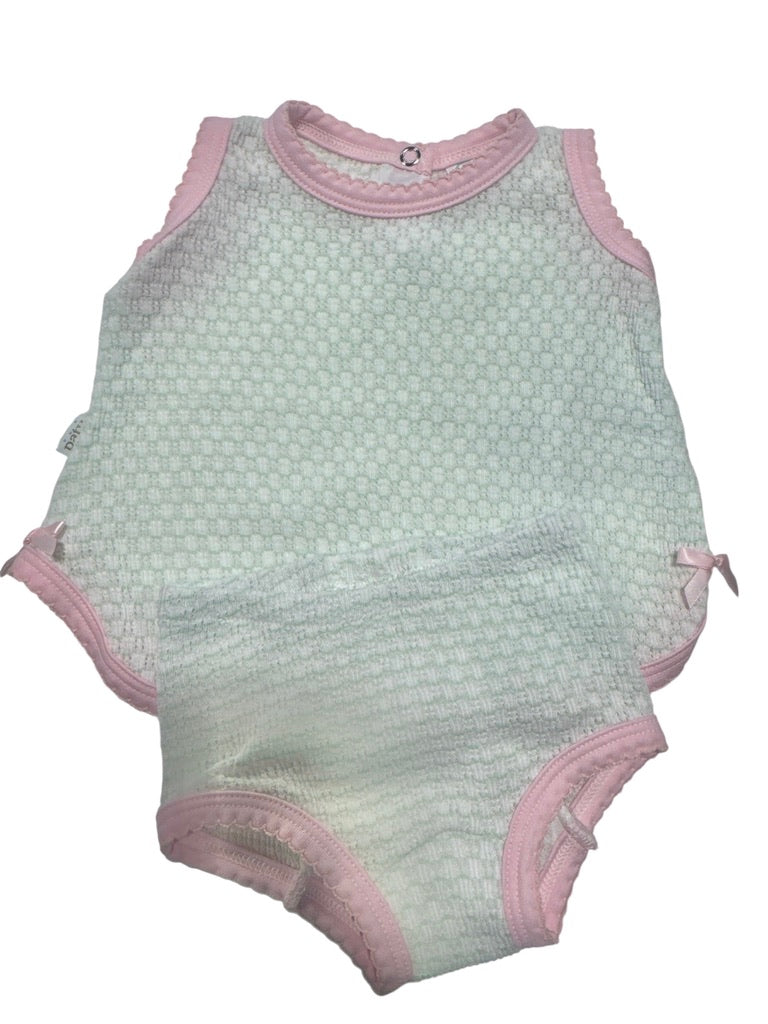 Paty Knit 2pc Sleeveless Diaper Set w/Bow Mint w/Pink Trim