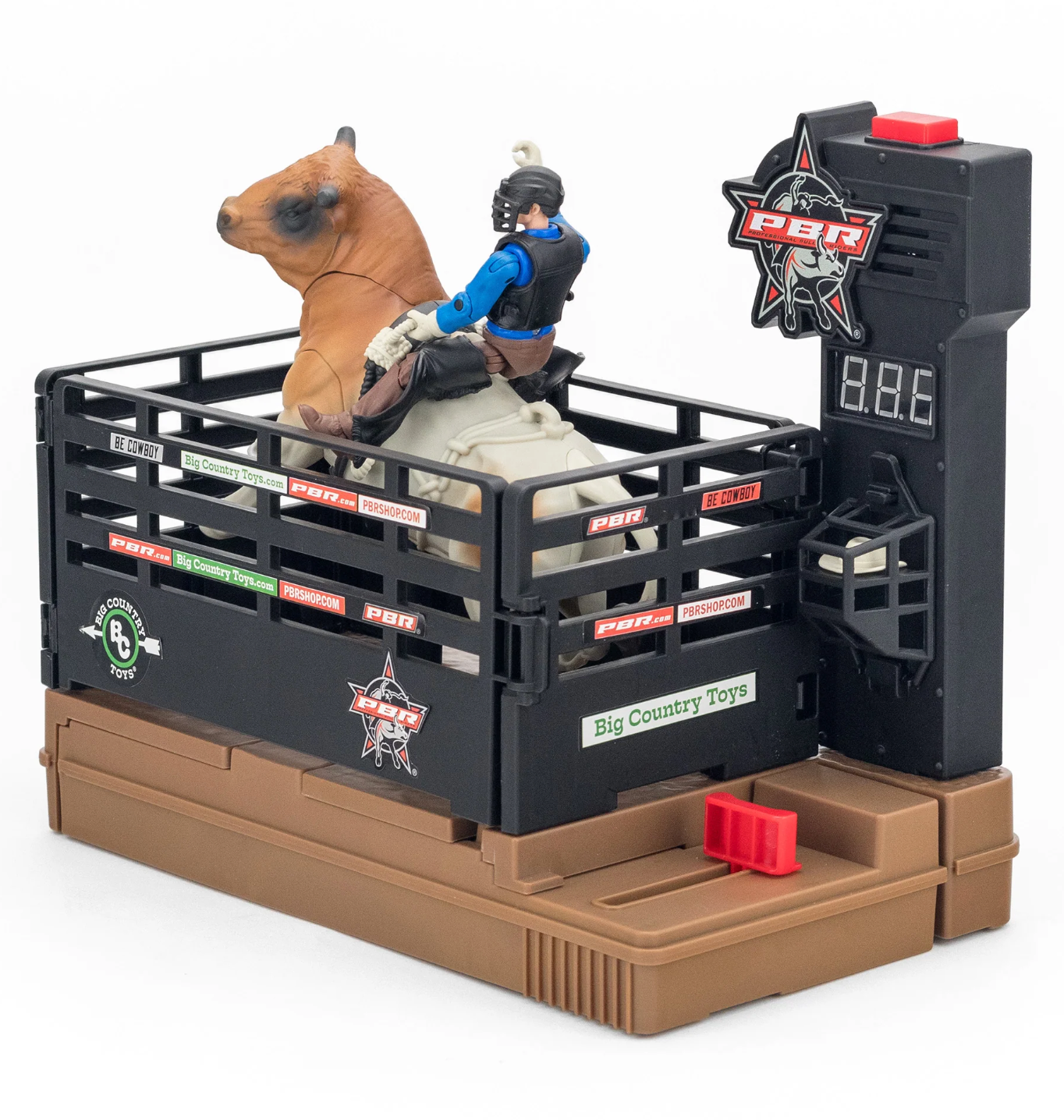 A first of its kind, this interactive playset features authentic bucking action, an 8-second timer, crowd noise, and play-by-play announcer audio. With the interchangeable bull and rider with helmet and cowboy hat, the thrill of PBR® is limitless!