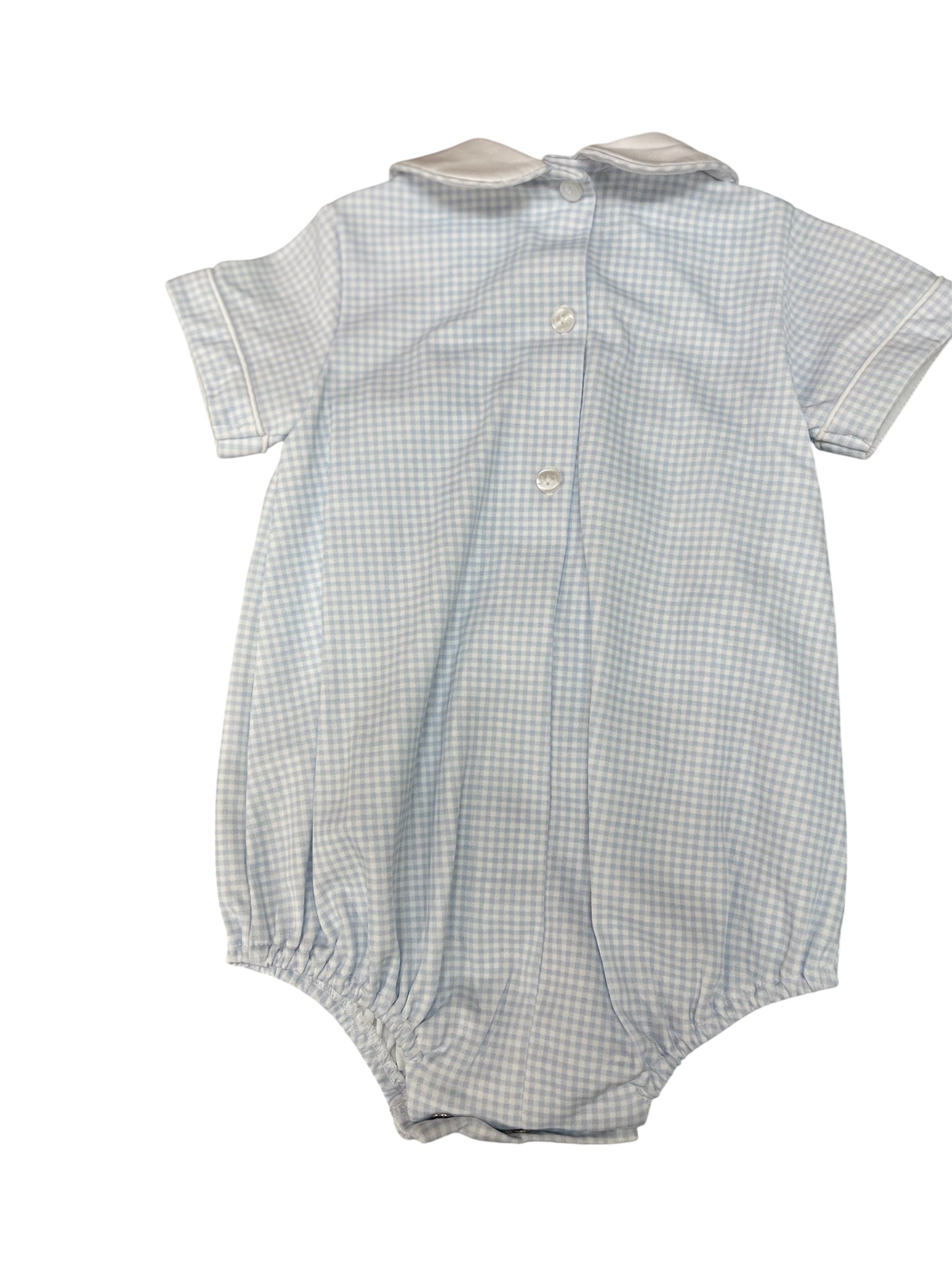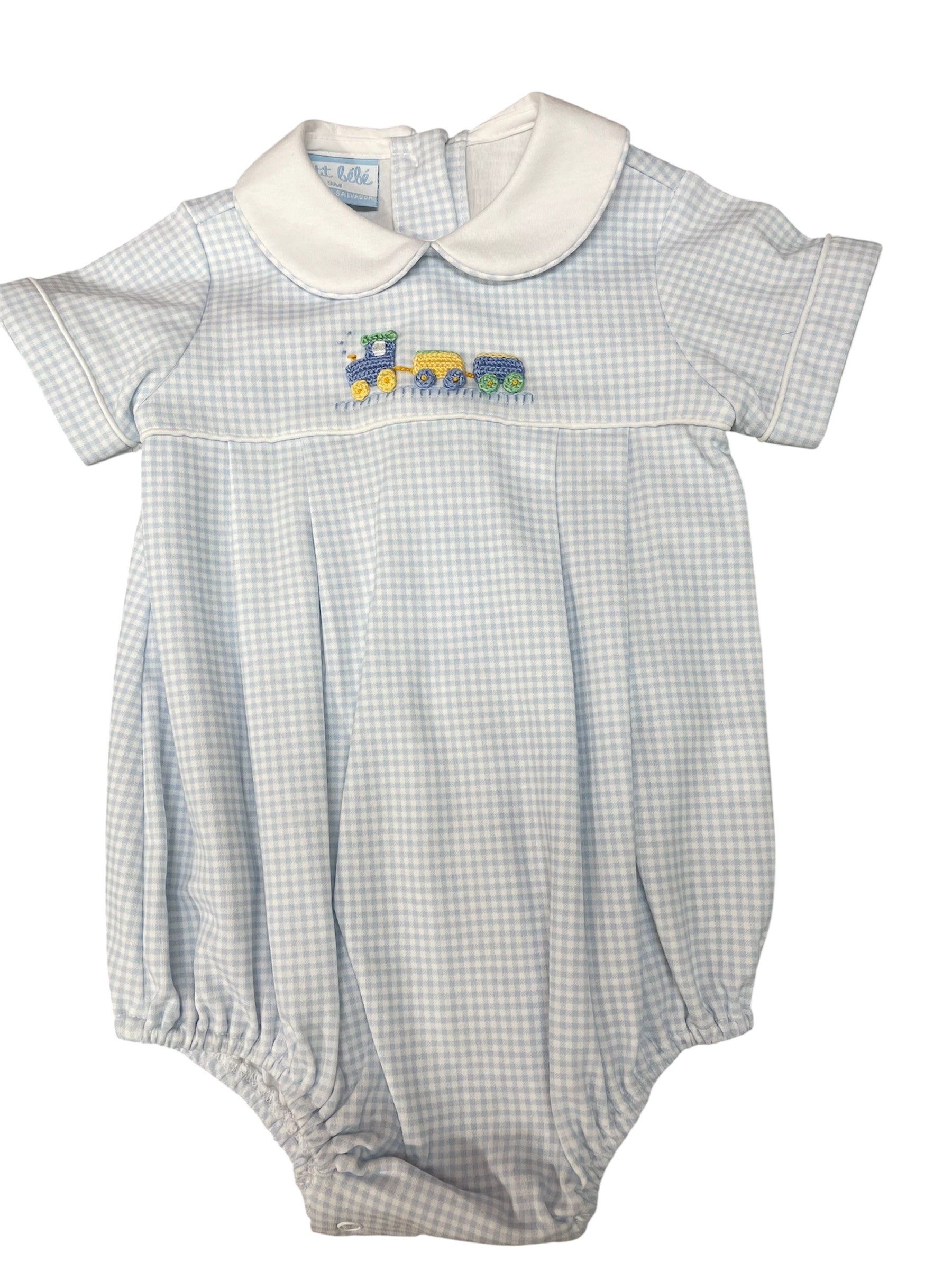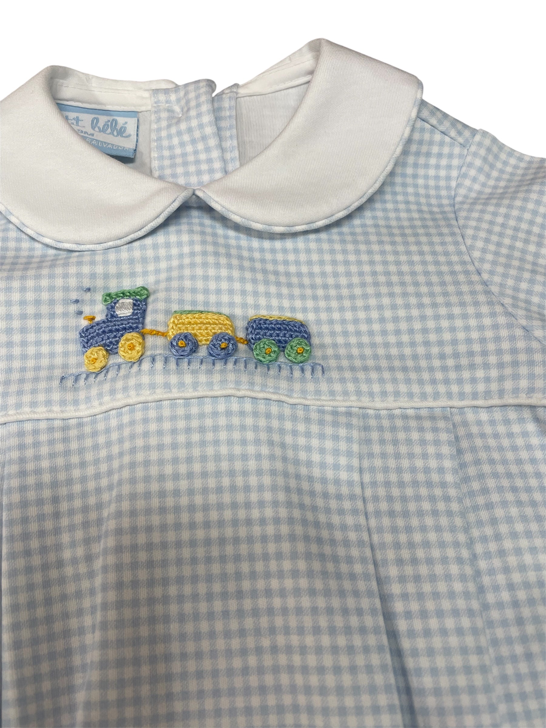 Petit Bebe Lt Blue Gingham Knit Bubble S/S with Train