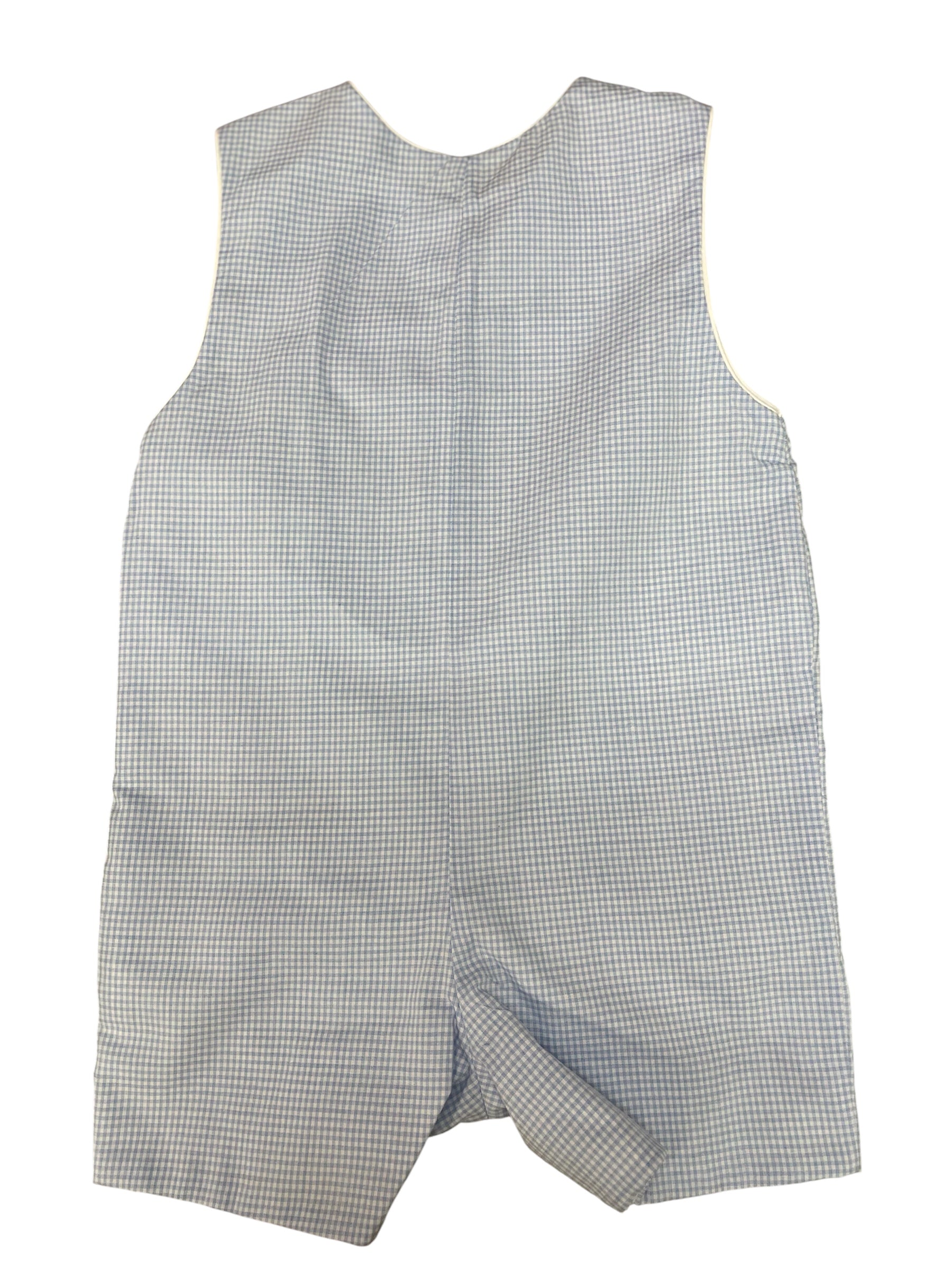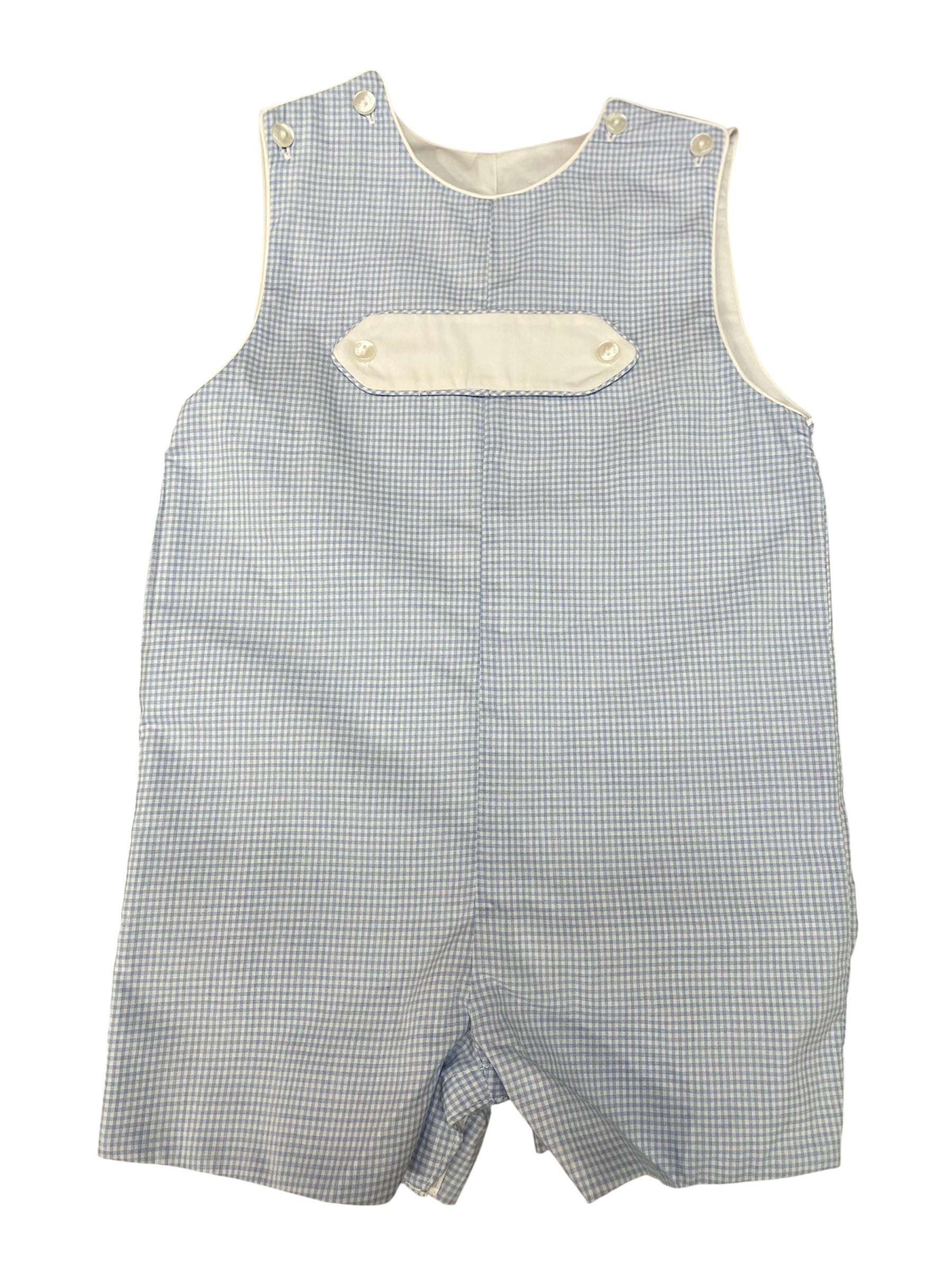 Petit Bebe Lt Blue Boy's Gingham Short Jon Jon with White Tab on Front. Monogrammable.