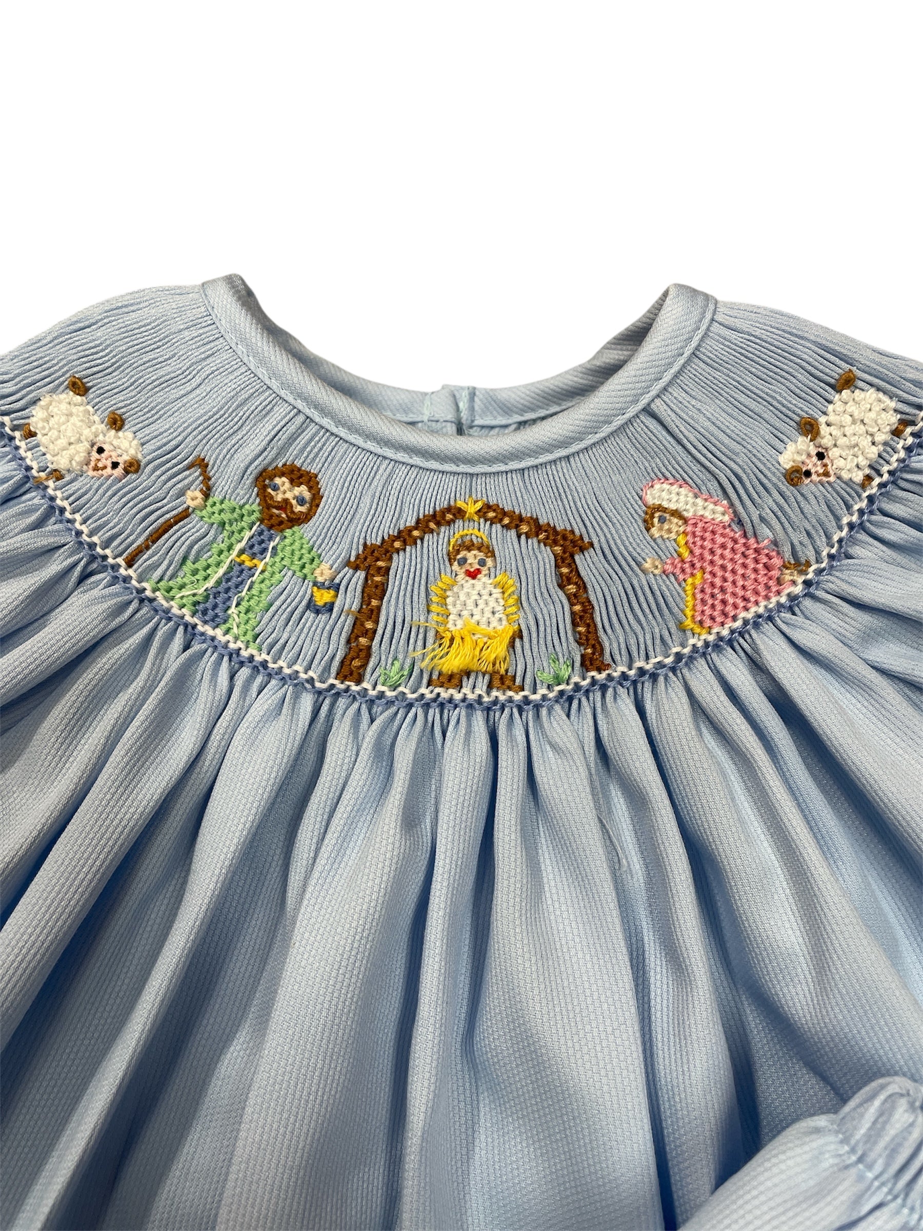 -hand smocked with a precious nativity scene around the neck line