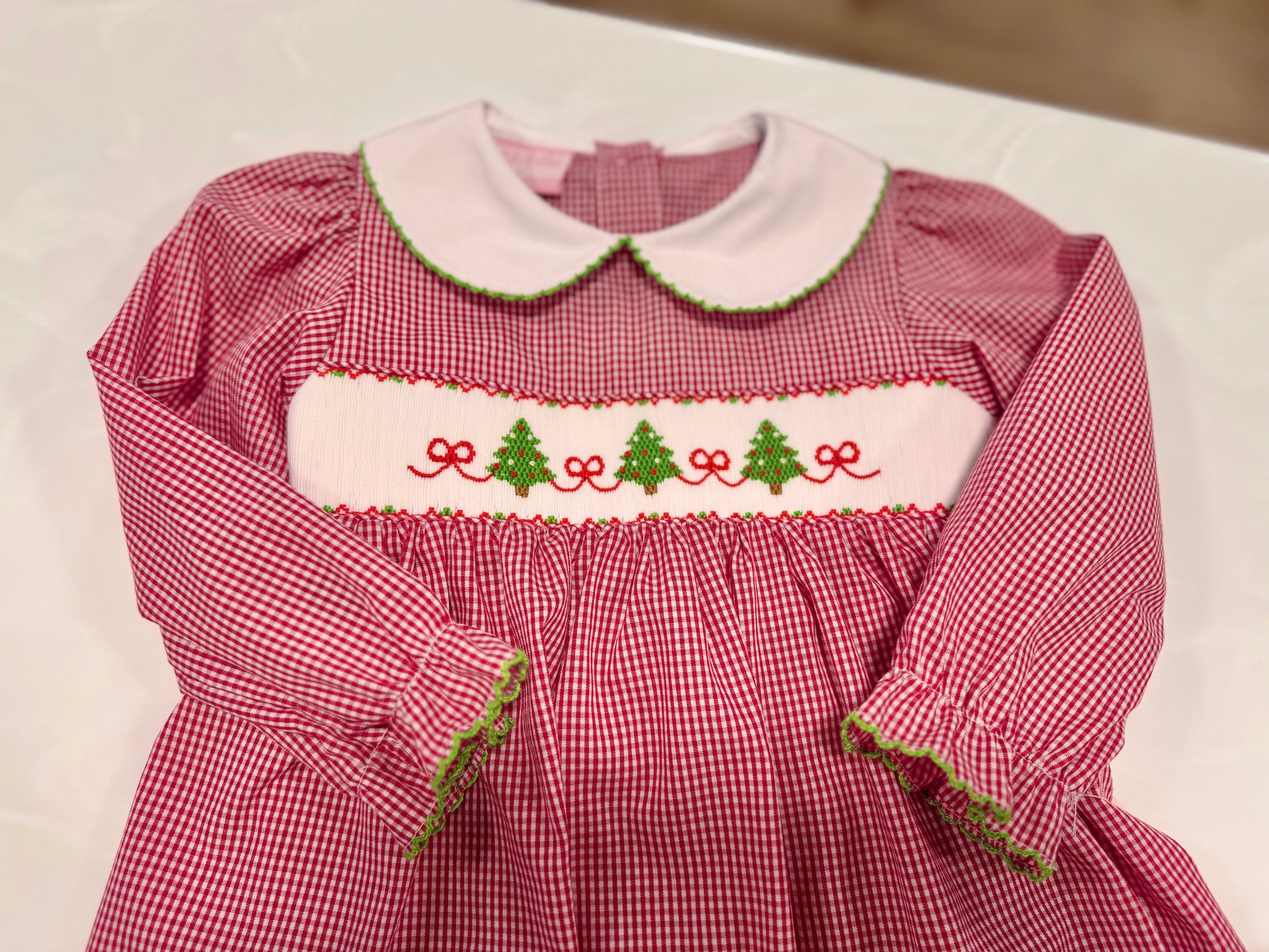 Petit Bebe Red Gingham L/S Dress Christmas Trees w/Bows.