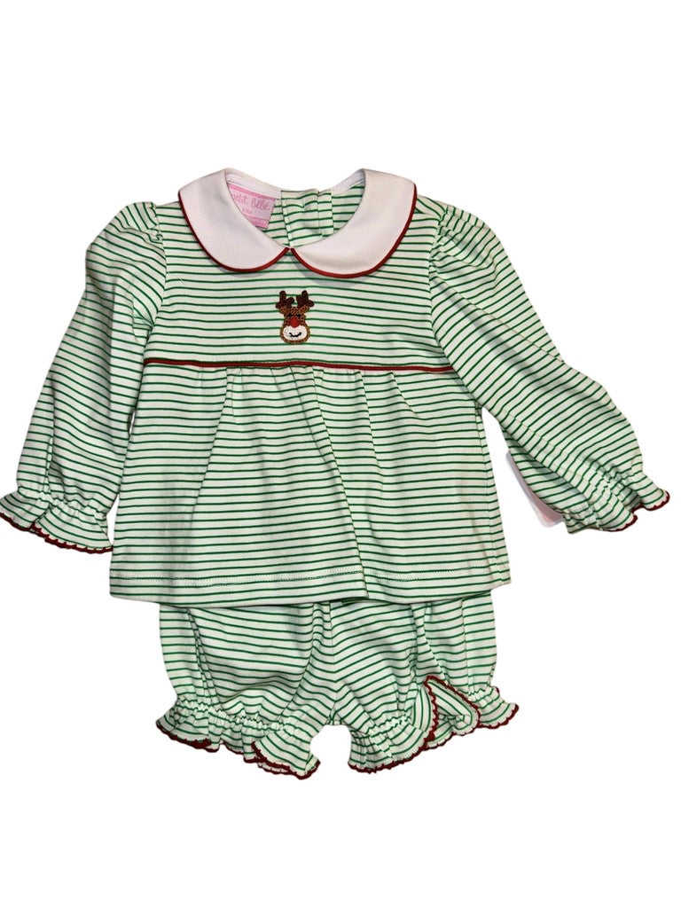 Petit Bebe Reindeer Face Green Stripe Bloomer Set.