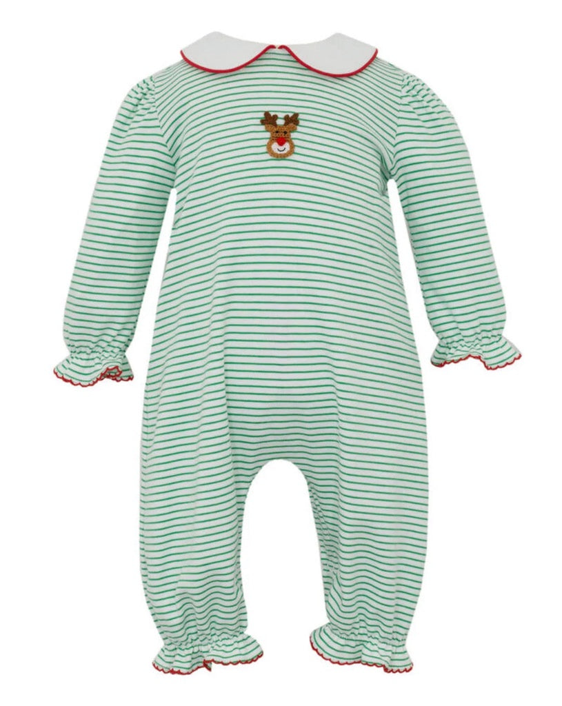 Petit Bebe Reindeer Face Green Stripe Girls Long Romper.