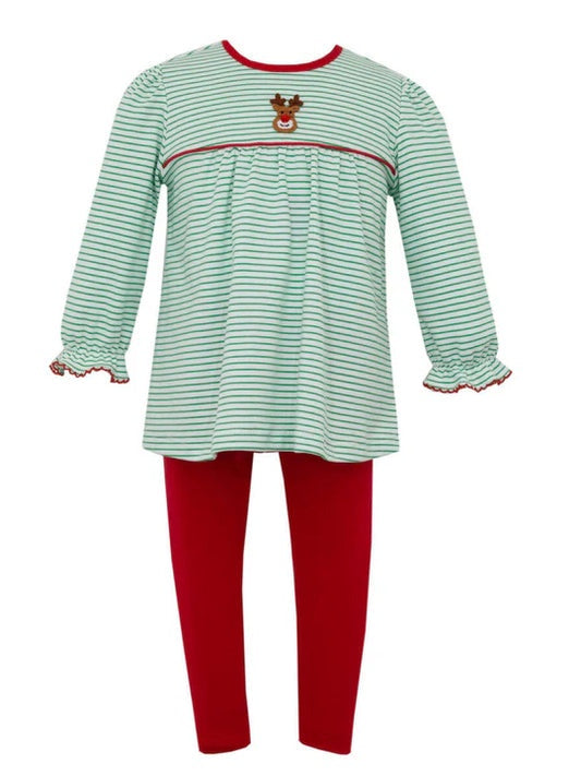 Petit Bebe Reindeer Face Green Stripe Tunic Set.