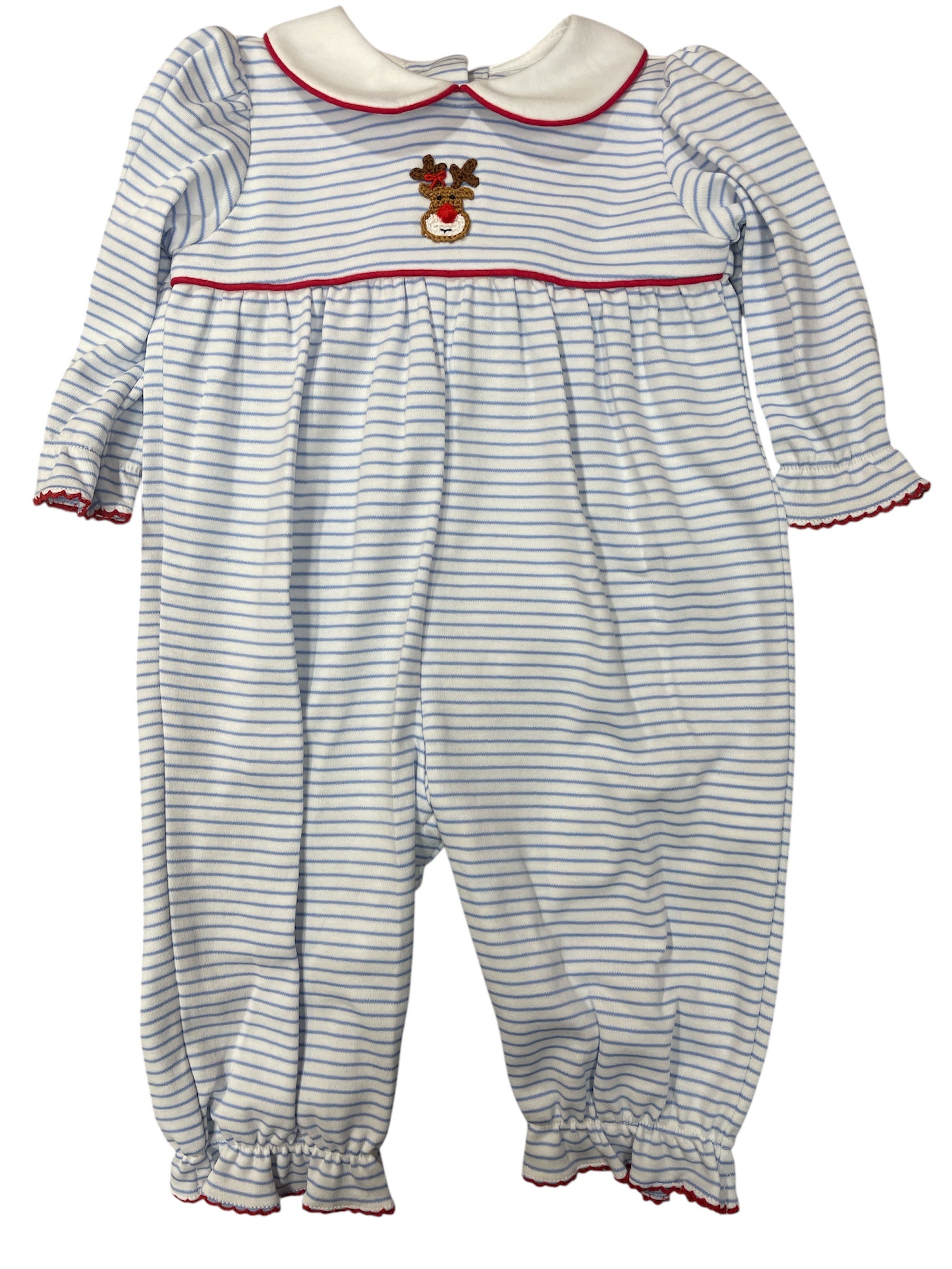 Petit Bebe Rudolph Girls Blue Stripe Romper - Long Sleeve