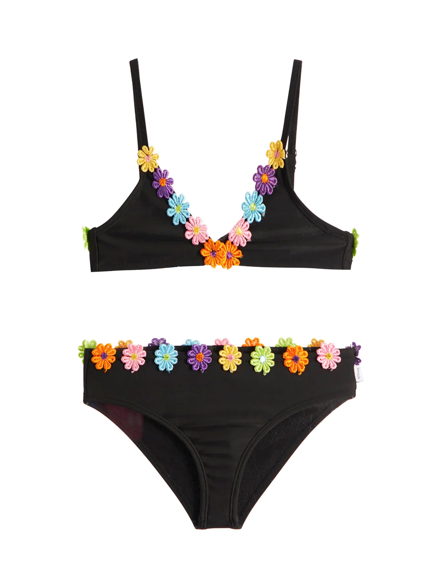This trendy and chic girls bikini is a summer must-have. A fun two-piece swimsuit, the Poppy bikini features multicolor floral trim with adjustable ties at the back and adjustable straps for full comfort.