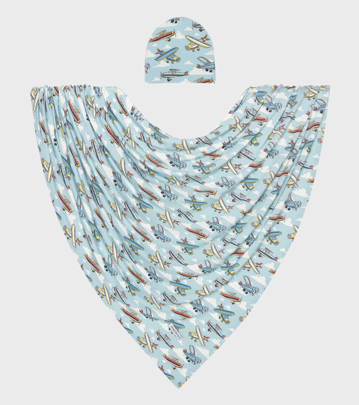 Posh Peanut Posh Planes Swaddle & Beanie Set.