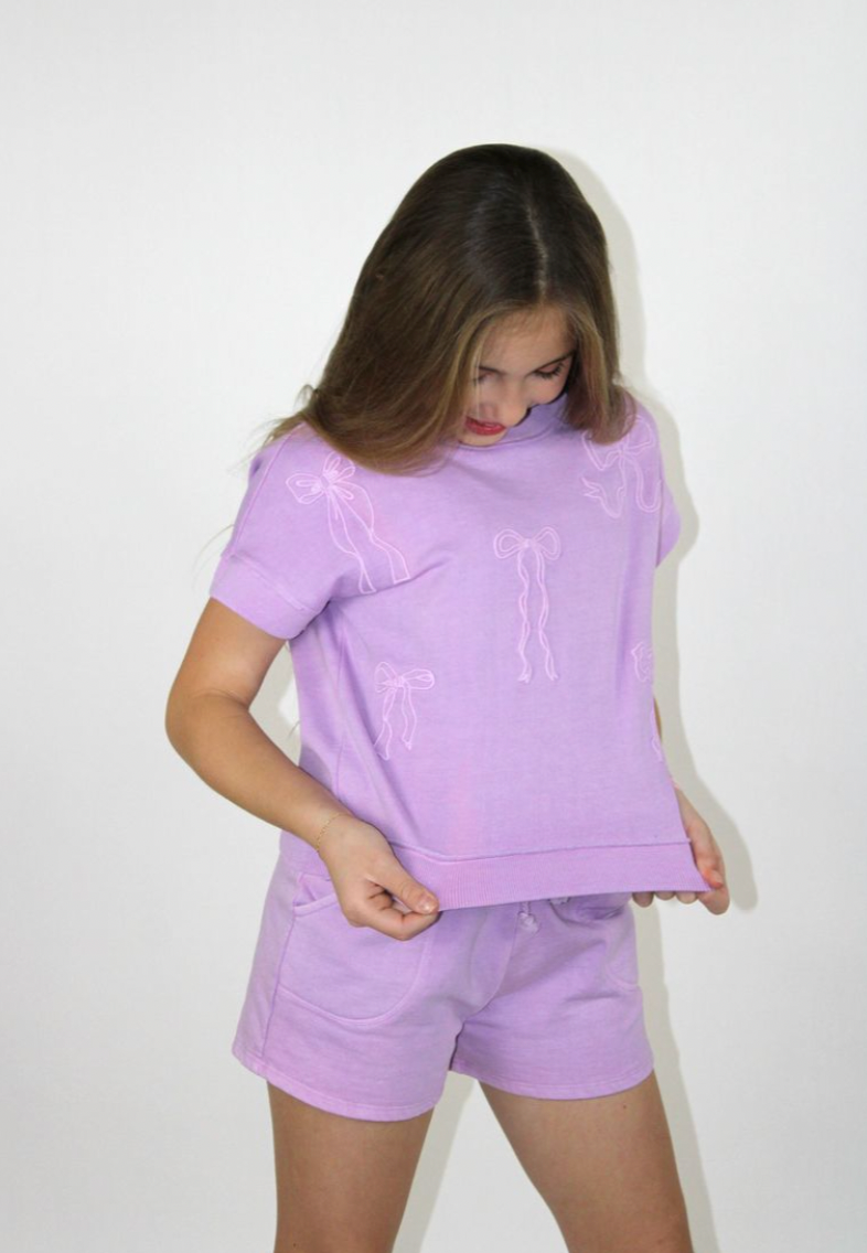 Tween acid wash cotton t-shirt with 3D puff embroidery laces and a crossed back.