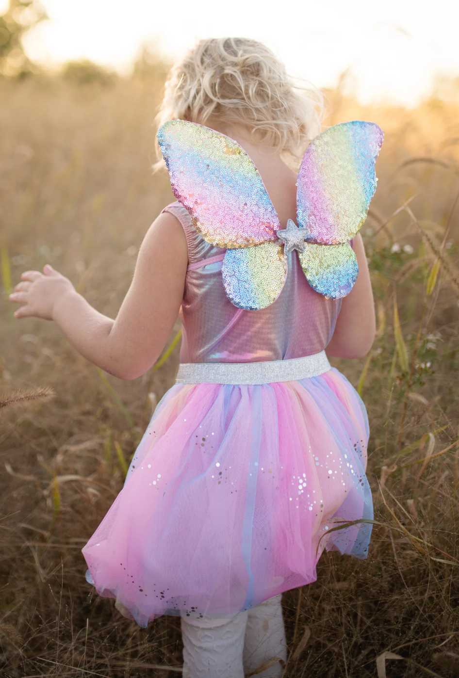 Enjoy all the sparkly fun without any shedding glitter! Our Rainbow Sequins Skirt is made with a wider elasticized waistband which allows for greater comfort and size flexibility. The multi-coloured rainbow skirt is layered and the top mesh layer features holographic heat-sealed sequins for that extra sparkly effect and no glitter shedding! This set includes a sequin-covered star wand with hot sealed flowing ribbons and wings that are covered in rainbow sequins & lined with beautiful pink satin. This is a great fun design, the skirt is machine washable, and it’s a truly beautiful ensemble!