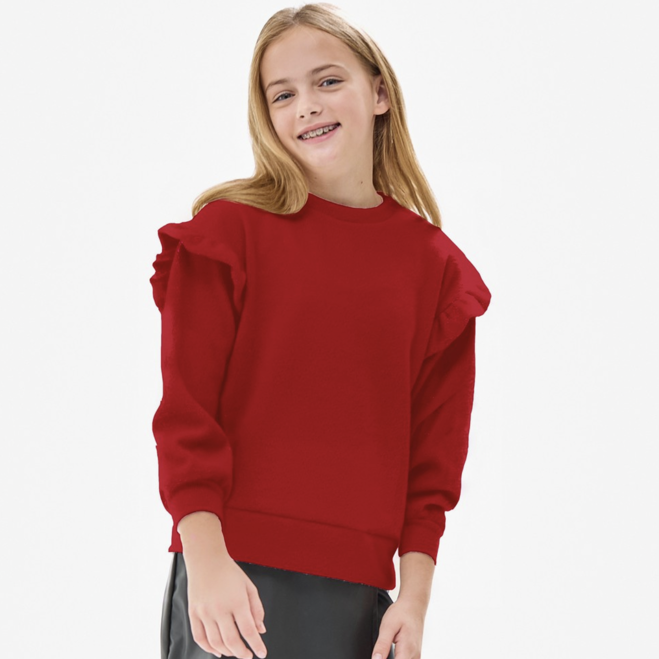 Red Ruffled Brush Knit Sweater.