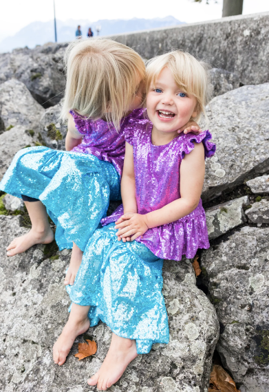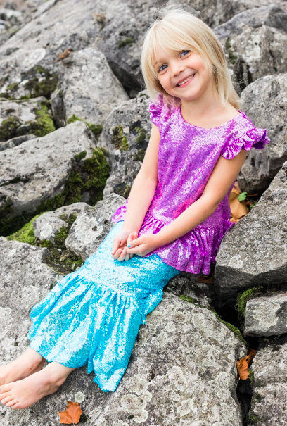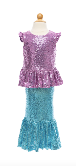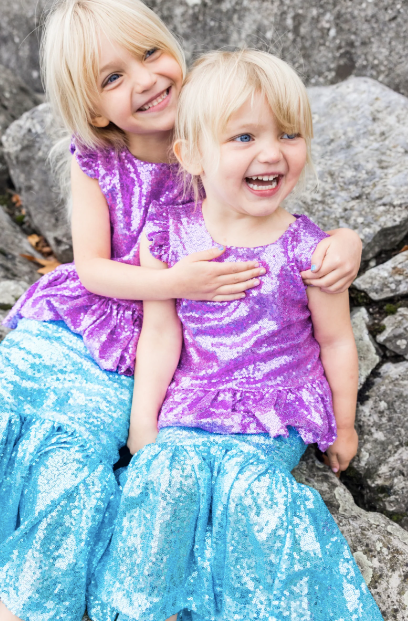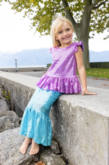 Shimmer through the ocean with our NEW Sequins Sparkle Mermaid Top & Skirt The peplum sequin top is made of thousands of stunning lilac sequins and has a zipper in the back. The mermaid silhouette skirt features beautiful sky-blue sequins with an elastic waistband. This set is sure to make a splash!