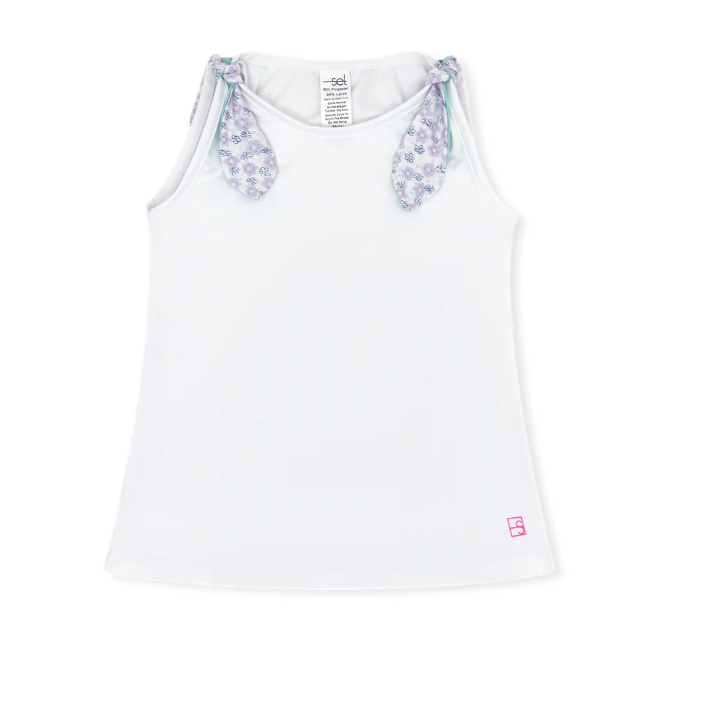 Introducing a new style! The Jessica tank is Pure Coconut has fun Blissful Blooms ties on the sleeves. Pair it back with any of our bottoms for a sweet look your girl is sure to love