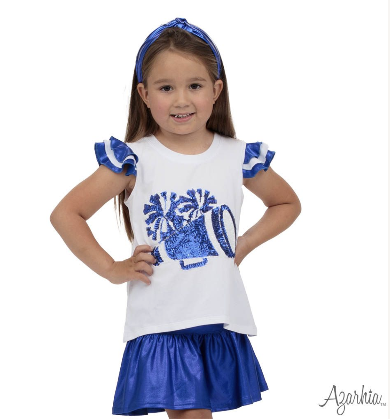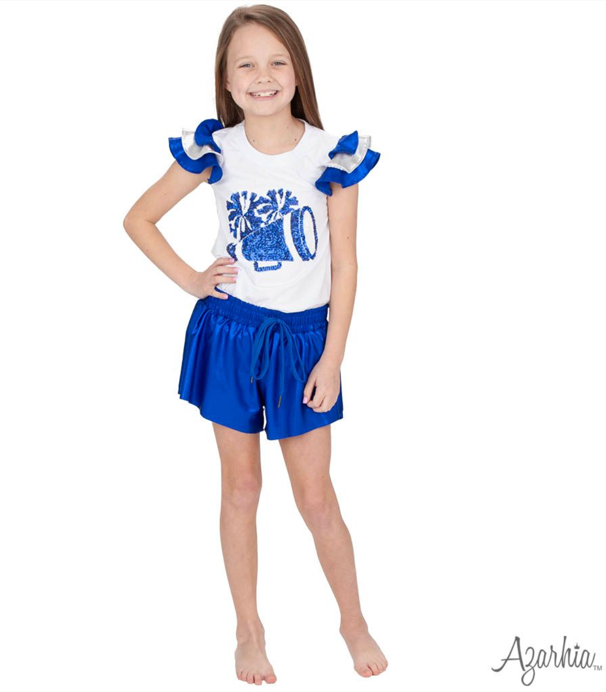 Shimmer Ruffle Sleeve Sequin Cheer in Royal Game Day.