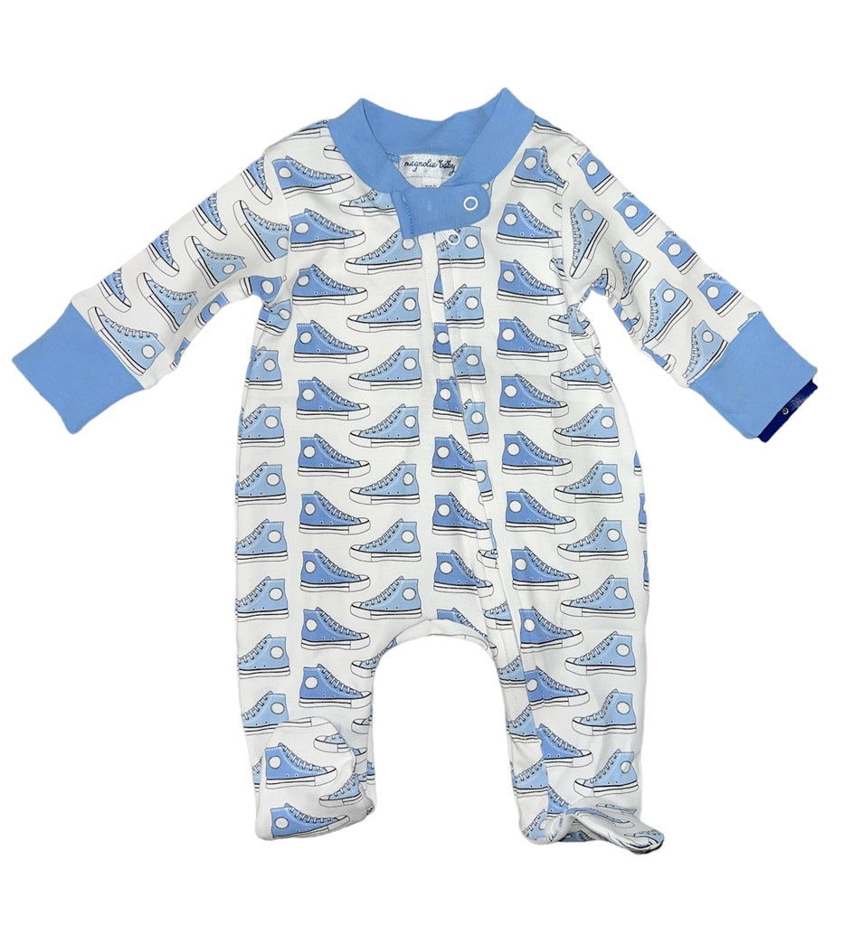 Magnolia Baby Sneakers Printed Zipper Footie in Blue.