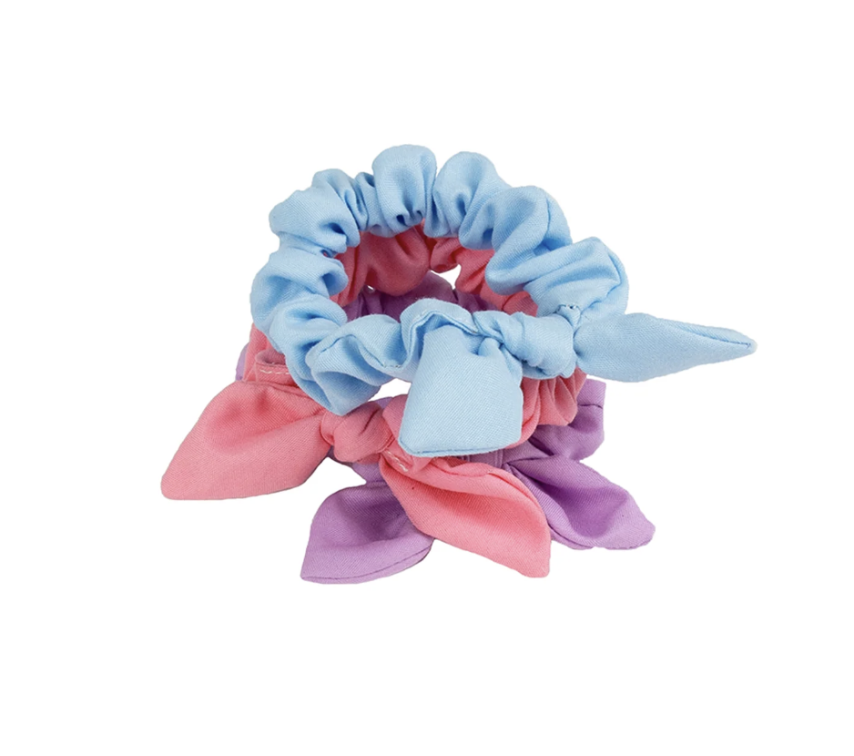 This 3 piece scrunchie looks great in your hair or around your wrist as a trendy bracelet. Made in lilac, pink and blue, this set makes the perfect hair accessory without the uncomfortable fit like a tradition hair elastic.