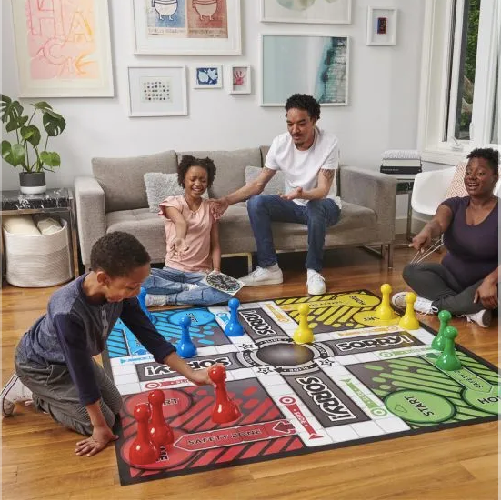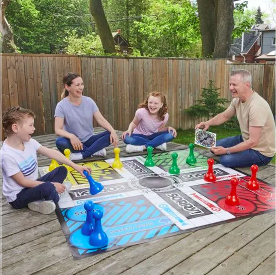 Ditch the TV, and rekindle with family game night with a classic board game. Slide, collide and score to win the Sorry! Game. In this giant edition, spin the wheel to see how far you get to move one of the pawns on the board. If they land on a Slide they can zip to the end and bump their opponents' pawns – or their own. Jump over pawns and hide in the Safety zone where opponents can't go. Kids keep on moving and bumping until they get all three of their pawns from start to home. But watch out, because if the pawn gets bumped, Sorry! It's back to start! Sorry! This extra-large game features a 64”l x 64”w illustrated vinyl gameboard perfect for indoor or outdoor gameplay.