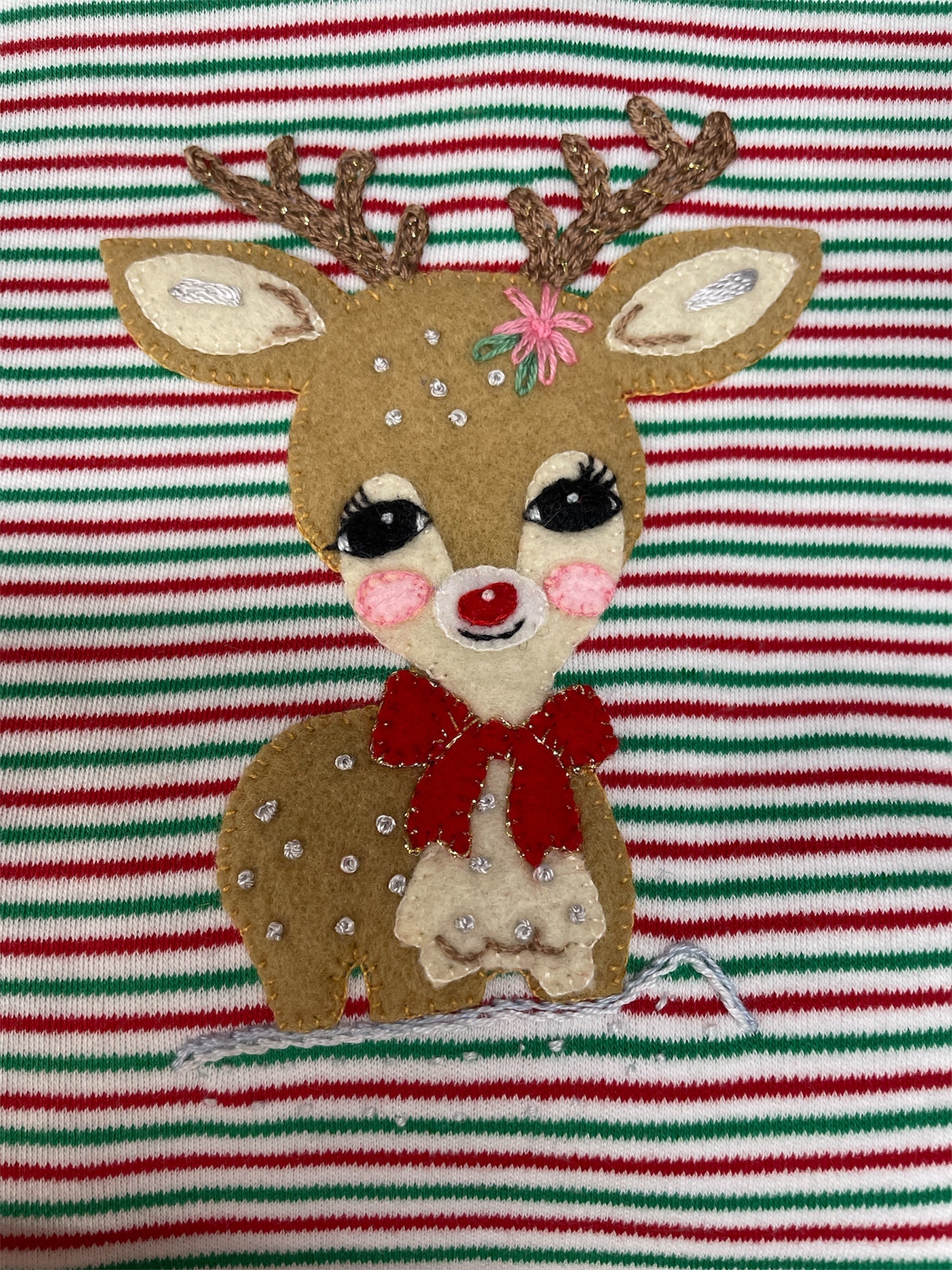 - Rainee the Reindeer is appliqued on the front of the shirt