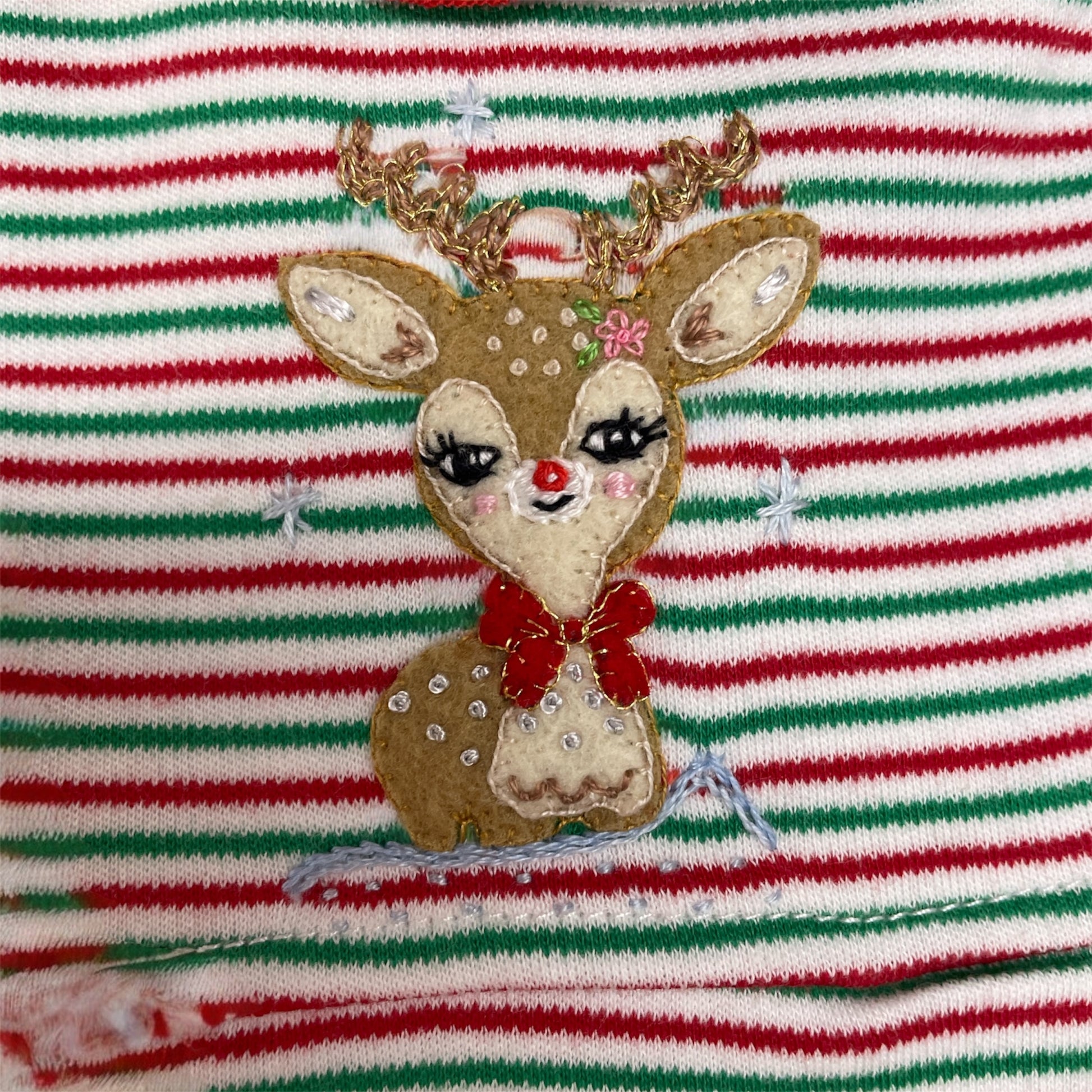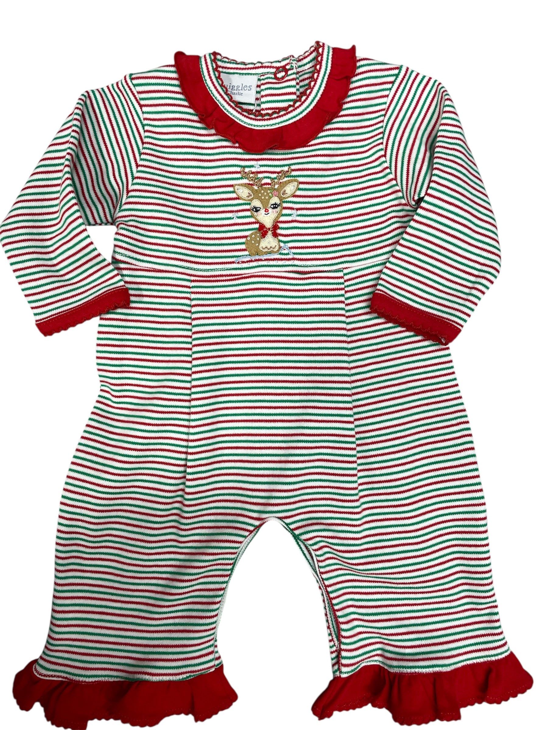 -Red, White and Green Striped Romper with Red Ruffle around the neck and feet