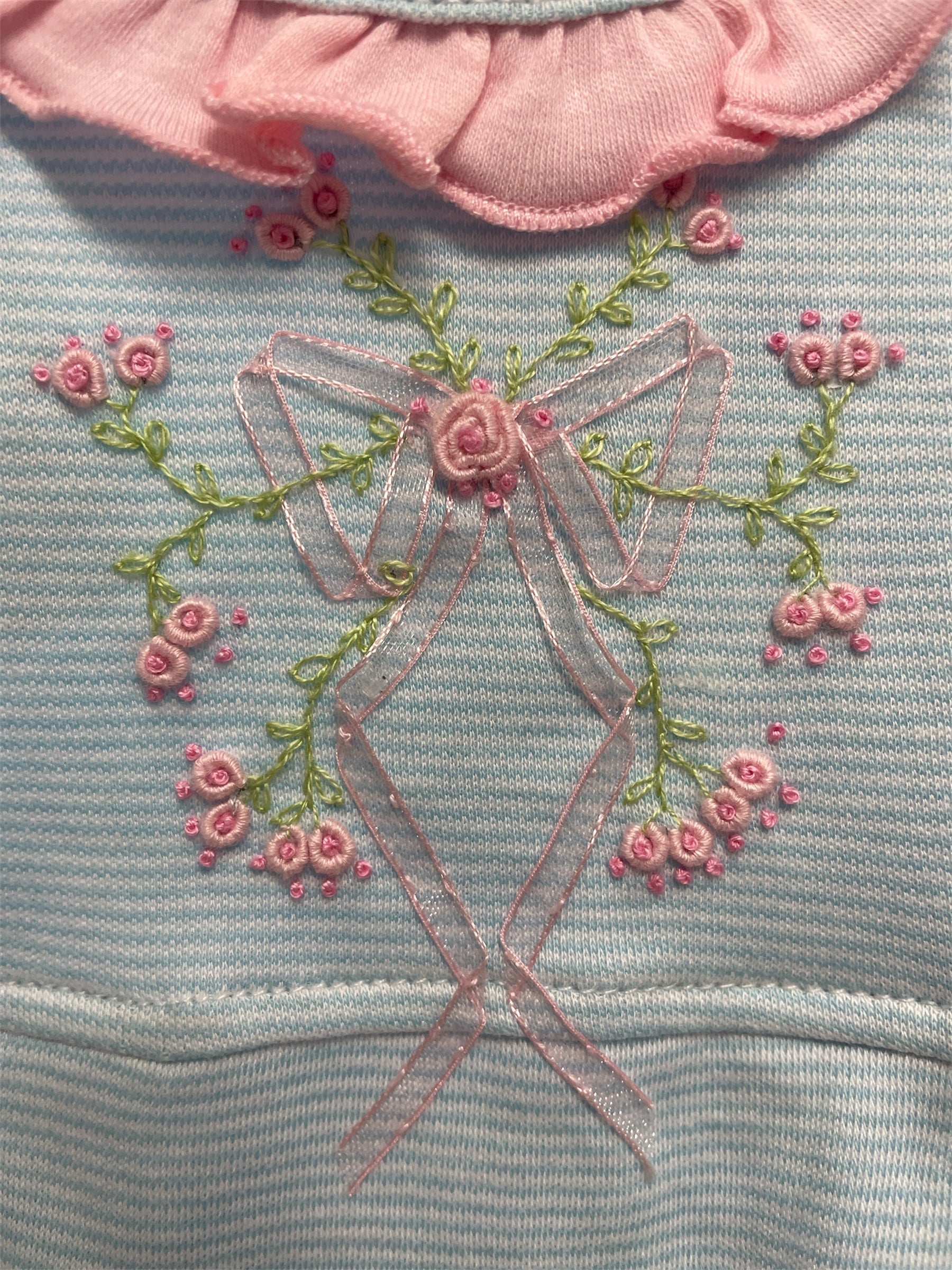 - beautiful embroidered rose bud detail on front around a pink bow