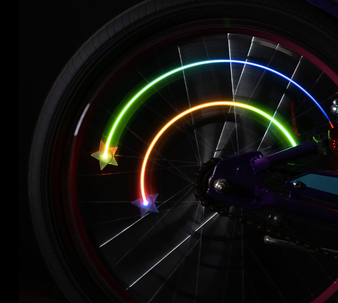 Includes 2 mini twinkling, color-changing LED spoke lights.