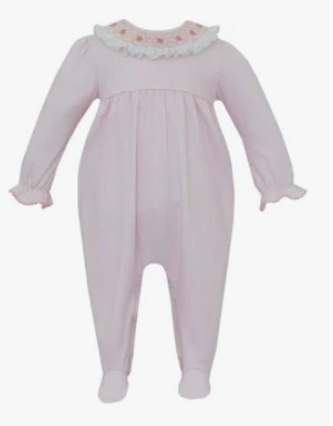 Stephanie Pink Gingham Knit Long Footie W/ Smocked Collar.