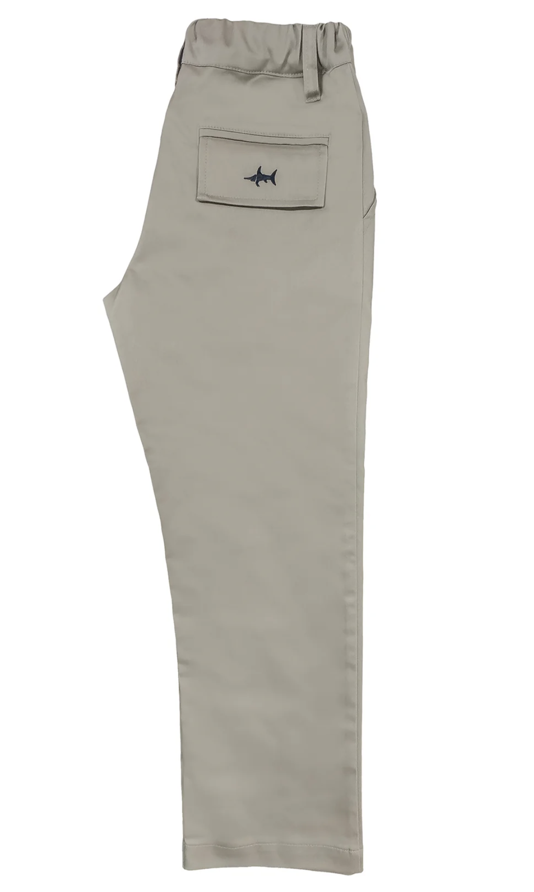 These pants have elastic in the back with a faux button on the flat front as well as belt loops. The back pocket features logo marlin embroidery.