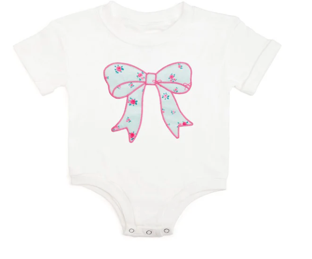 Brighten her little world with this darling romper featuring a sky-blue bow patch filled with a dainty rosebud print for a look that’s as sweet as a sunny day.
