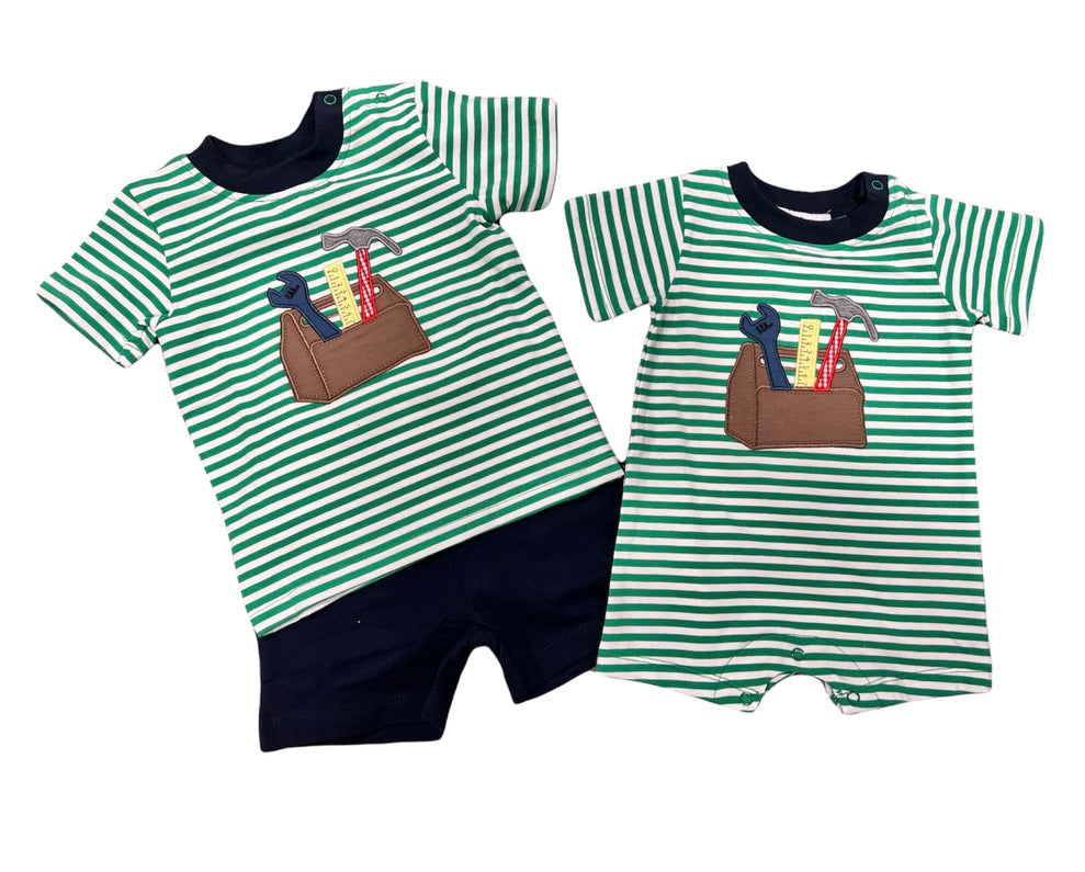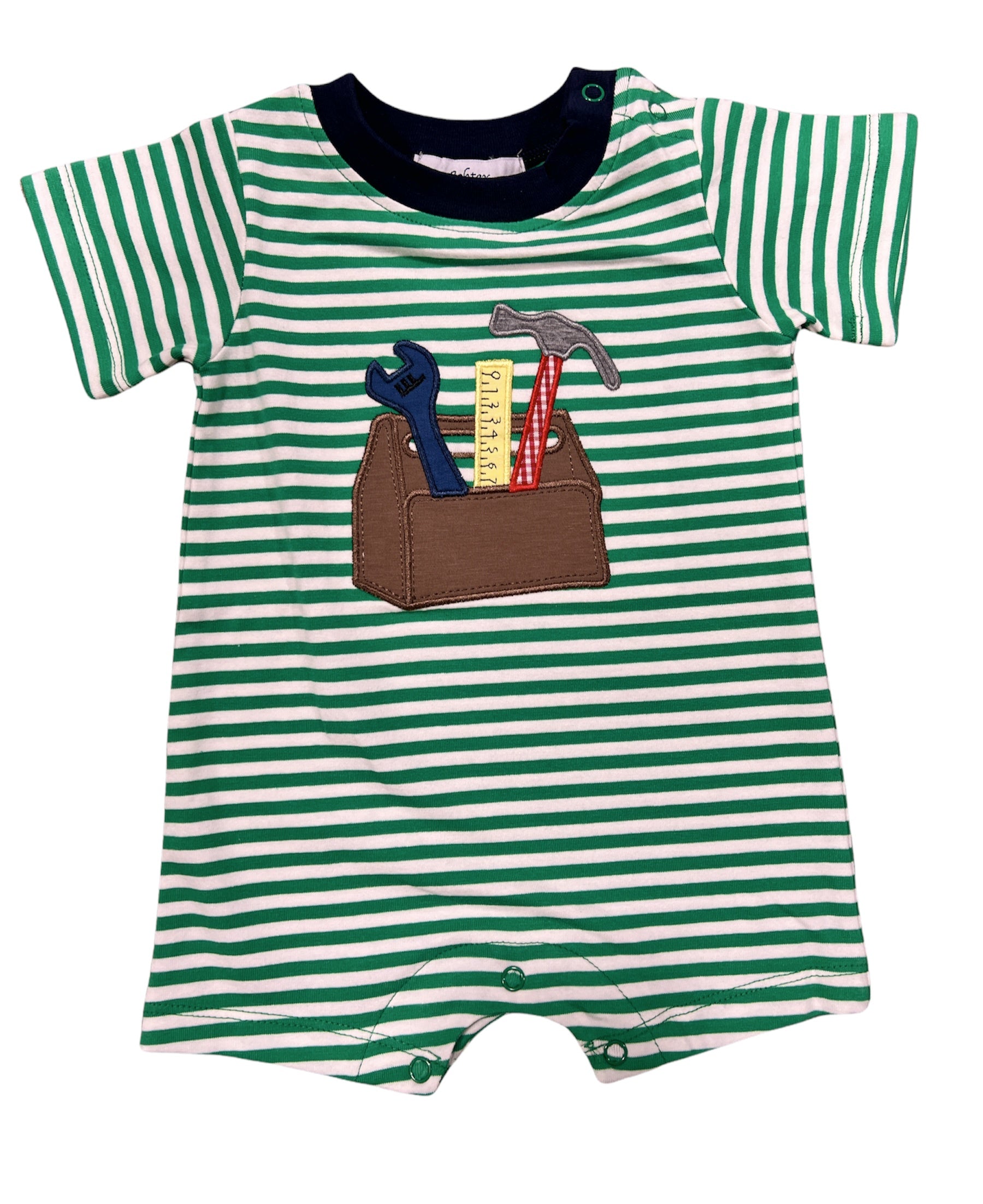 Kelly Stripe Boys Romper with Toolbox Applique.