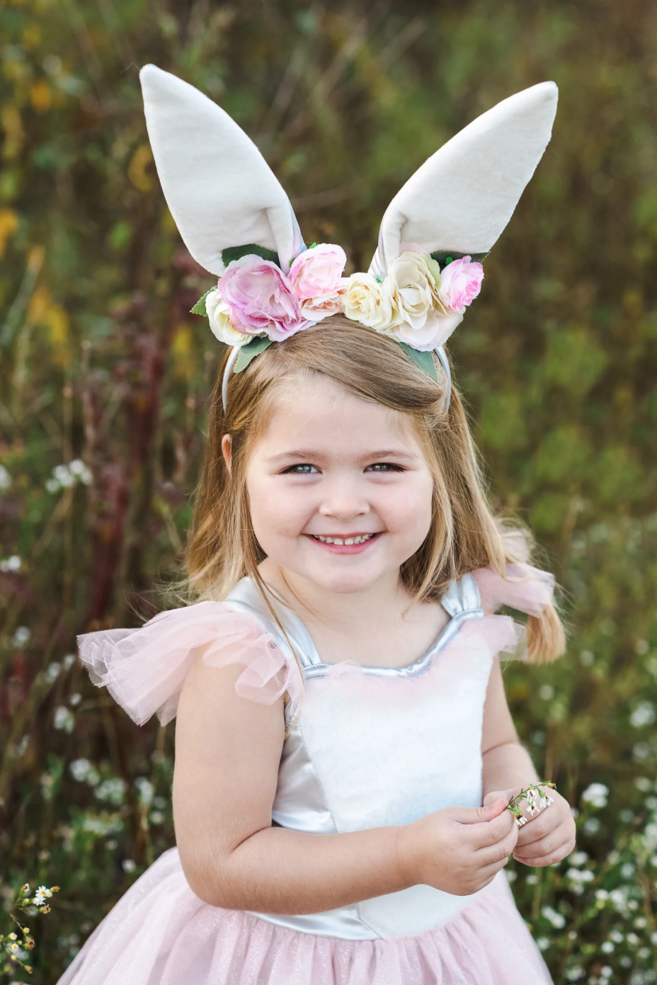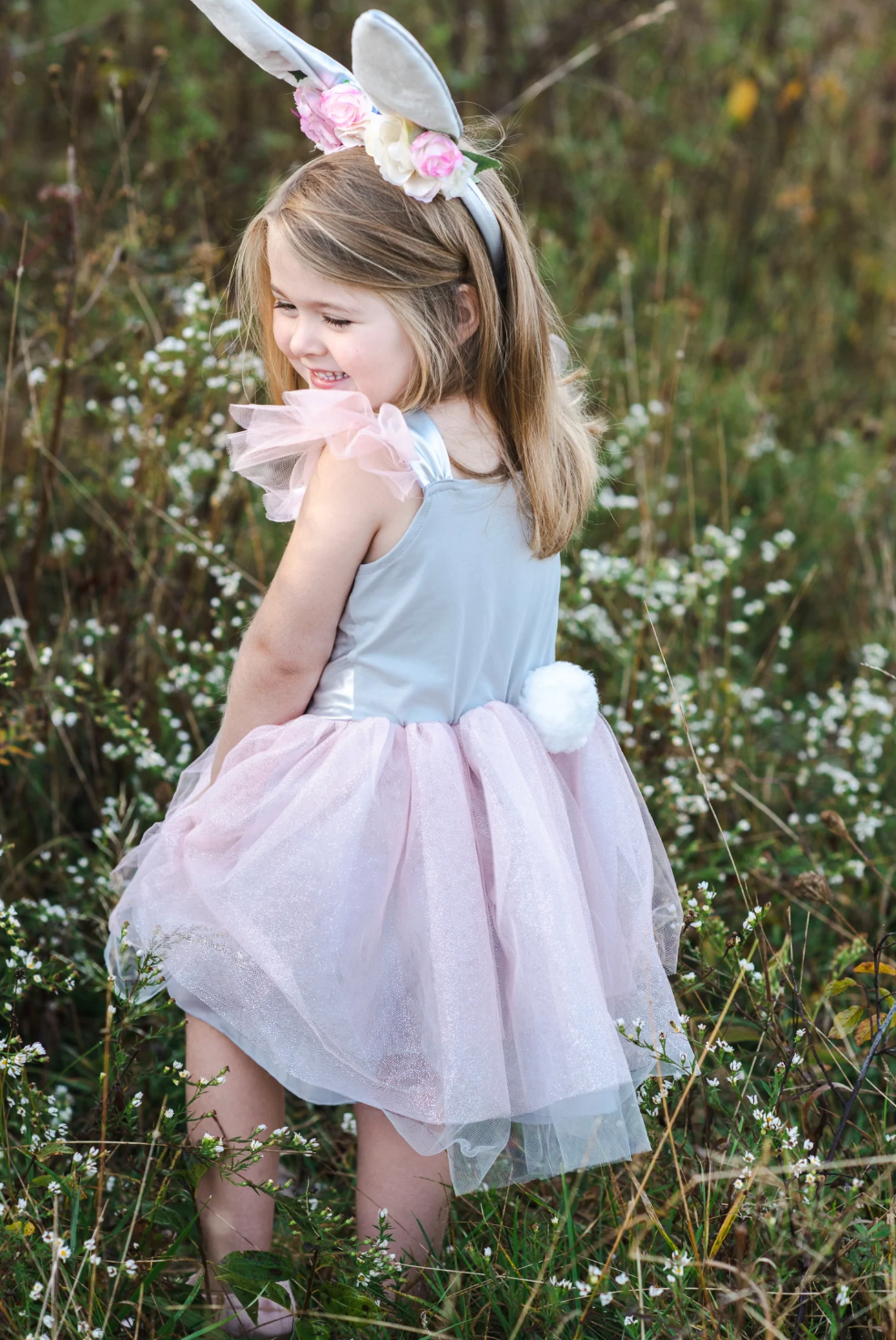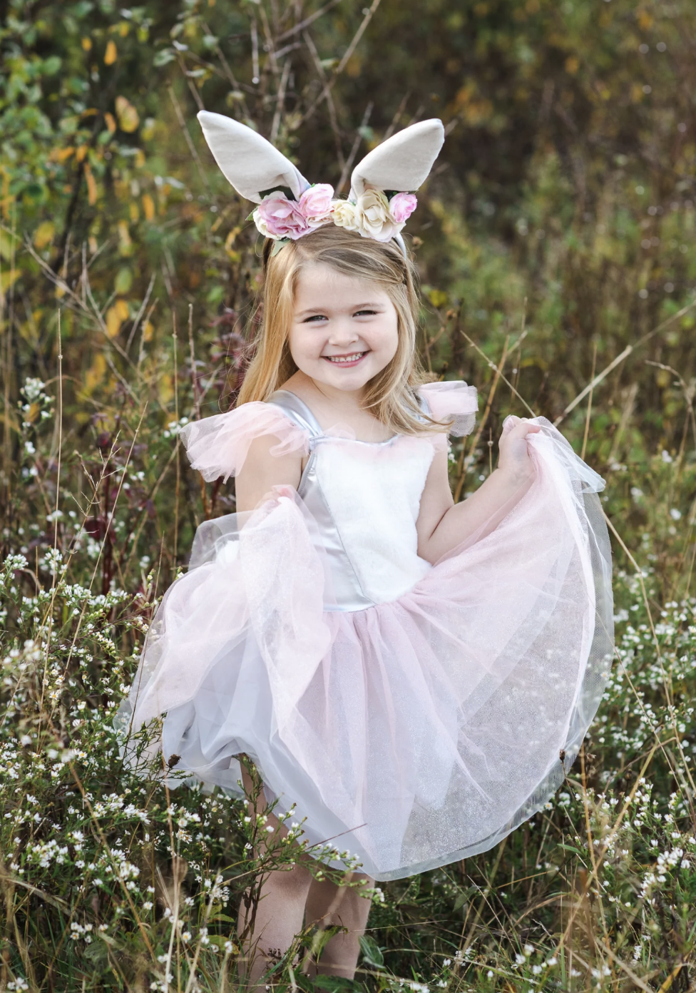 Spring has officially sprung and it is time to celebrate! Our new Woodland Bunny Dress & Headband set will have you hopping into spring. This outfit is made with the softest, fur bodice that will make you feel like a real bunny. The dress is finished with a beautiful pale pink tulle skirt and matching tulle sleeves. This outfit is complete with a cute bunny tail on the back of the dress, and a whimsical tall bunny ears headband.
